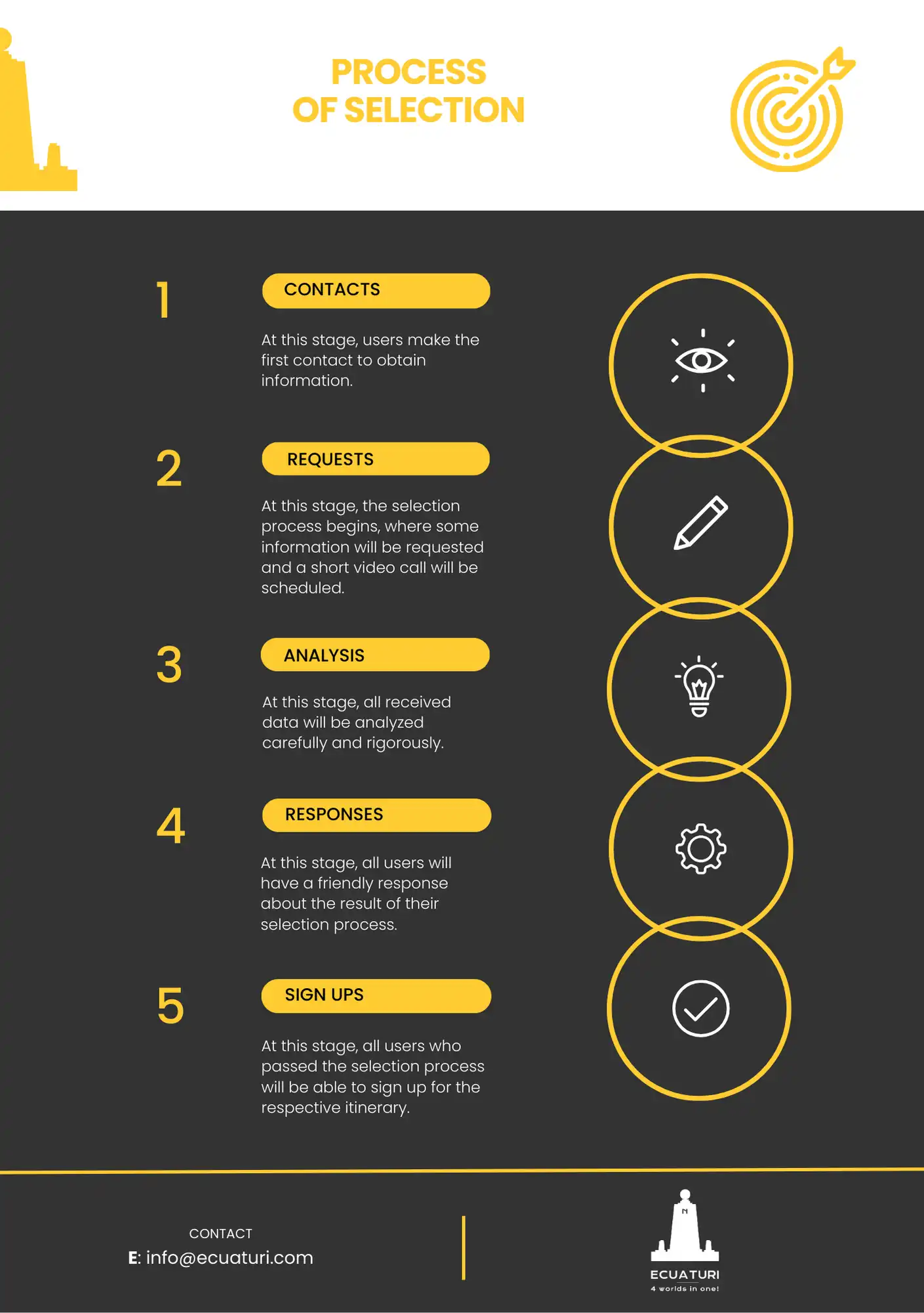 The first contact should be made by email to "info@ecuaturi.com".